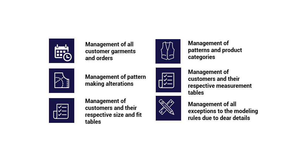 All this is possible thanks to a single collector of information that manages e interfaces the model area with the ERP systems and the point of sale. Once you have entered the customer’s measurements internally through a special web portal, the system will extract the patterns from which to obtain the garment and will define its characteristics. The user is guided in creating the order in the store, with the help of visual aids.